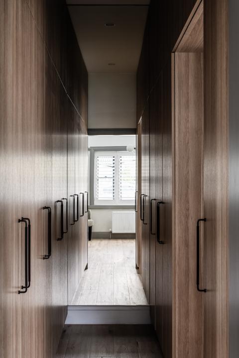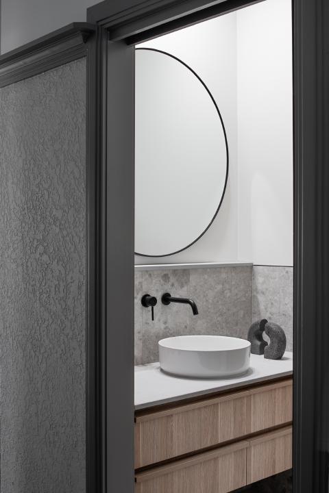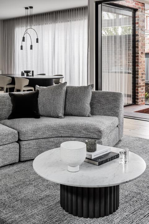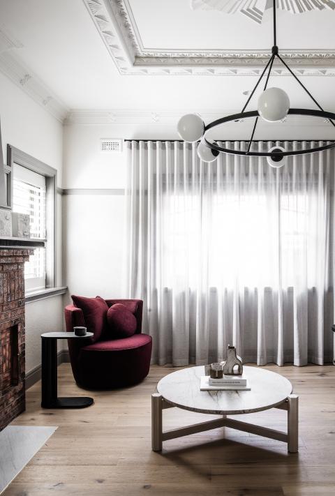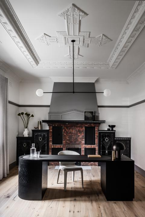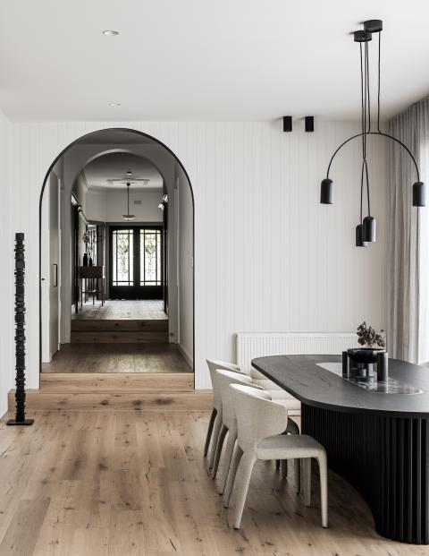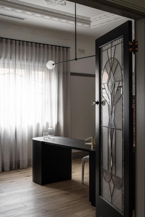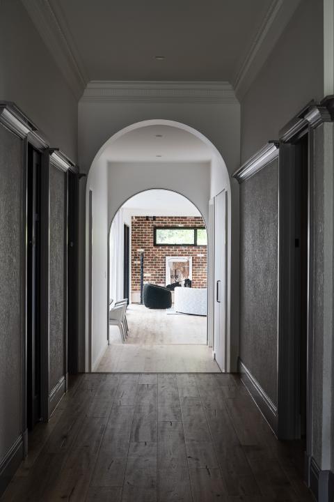 Internally, the existing order is clarified rather than erased. Decorative plaster ceilings and leadlight glazing set the character of the retained rooms, while timber flooring carries through to create continuity into the newer areas. Arched thresholds mediate movement between spaces and level changes are expressed rather than concealed, giving definition to circulation. Joinery is integrated with aligned reveals so detailing reads as part of the architecture.
