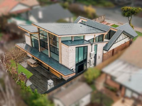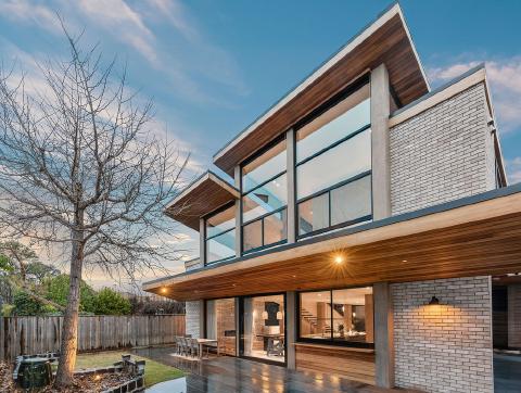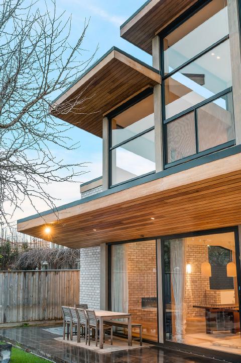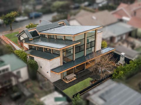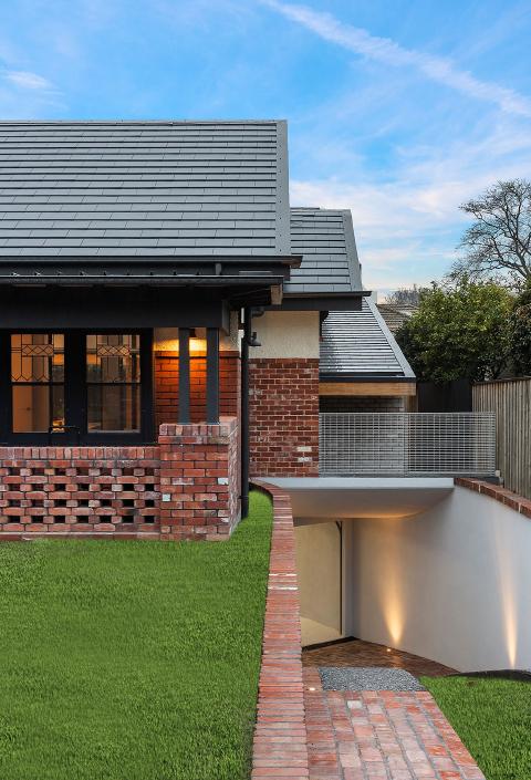 Boulevard Bungalow pairs the retention of a brick Californian bungalow frontage with a contemporary rear addition and a new basement level in Hawthorn. The original street-facing form is preserved, with new massing held behind the existing roofline to maintain the established scale and character. To the rear, a cathedral volume introduces a strong roof profile and double-height glazing, bringing controlled daylight into living spaces while maintaining privacy to boundaries.