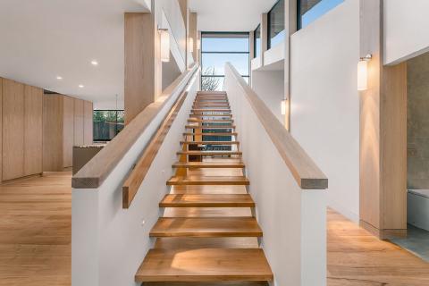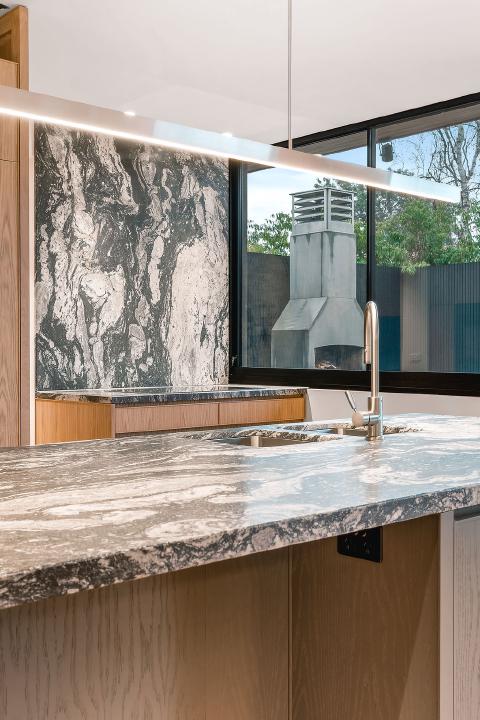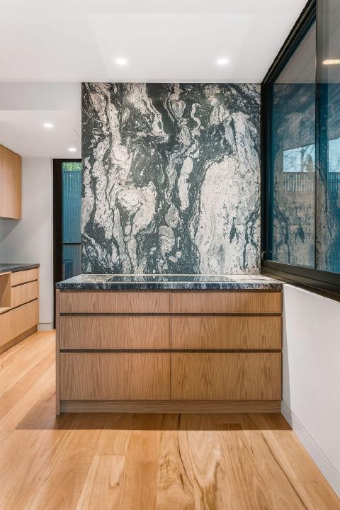 Internally, the plan is organised as a clear sequence from retained rooms to expanded family areas. Exposed timber elements and a warm, tactile palette sit alongside integrated joinery detailed with consistent reveals and flush transitions. Practical spaces are absorbed into the layout, including a mud room that supports daily routines without interrupting circulation. Where required, structural steel remains expressed so the extension reads with clarity rather than concealment.