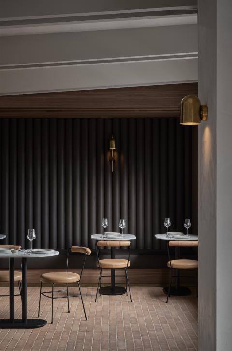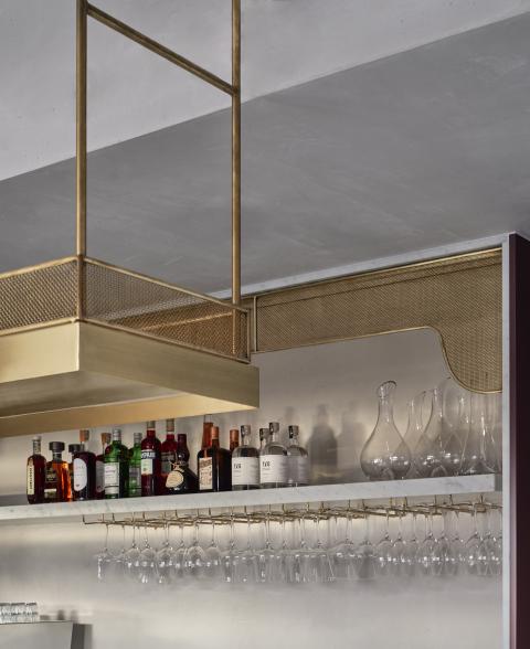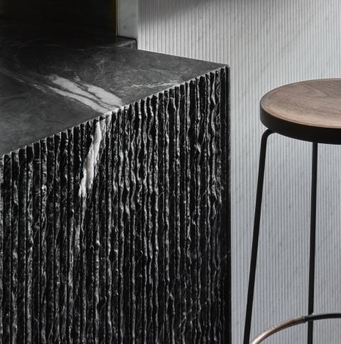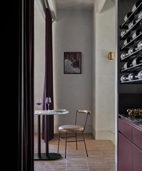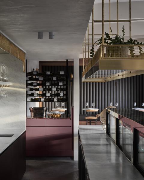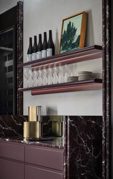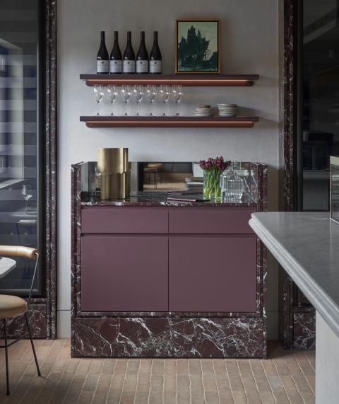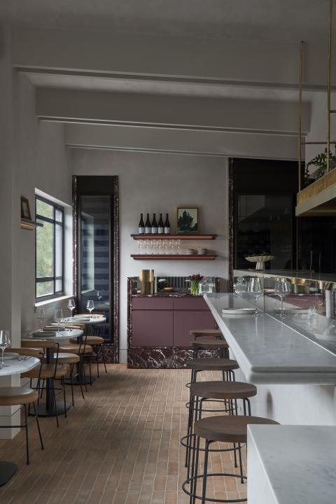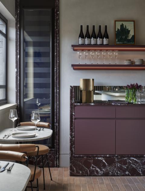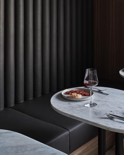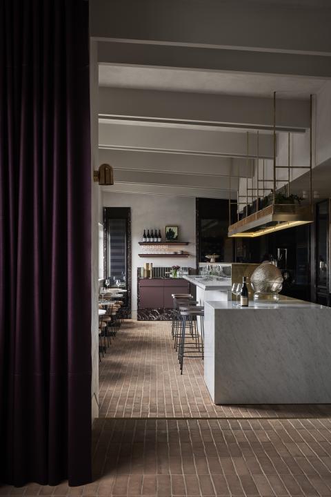 Material choices establish a restrained register built on texture and weight. Handmade clay floor tiles run wall to wall to ground the rooms, paired with stone, brass and dark timber. The bar is capped in Carrara marble and lined in fluted granite, while burgundy cabinetry and darker stone accents add depth. A textured ceiling softens reflected light across joinery and glazing, and seating is detailed with timber framing and leather bolsters to hold warmth without excess.