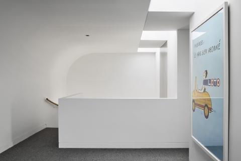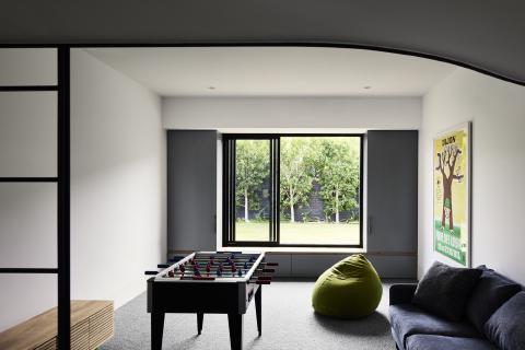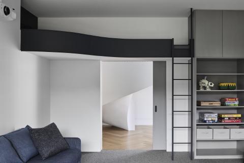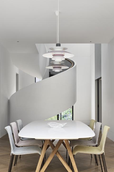 Inside, the interior is organised around a helical stair that links levels and provides a clear point of orientation. Curved plaster junctions and continuous ceiling lines carry the geometry through the plan, while light wells and carefully positioned glazing balance the deeper parts of the house. Integrated joinery consolidatstorage and services to keep rooms calm, and thresholds are resolved through consistent alignments rather than shifts in finishes.