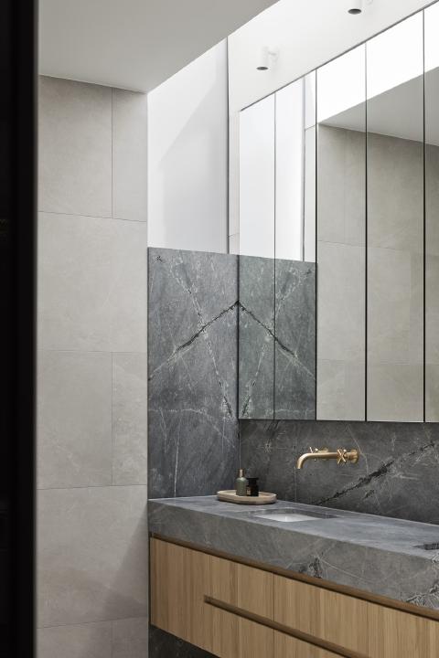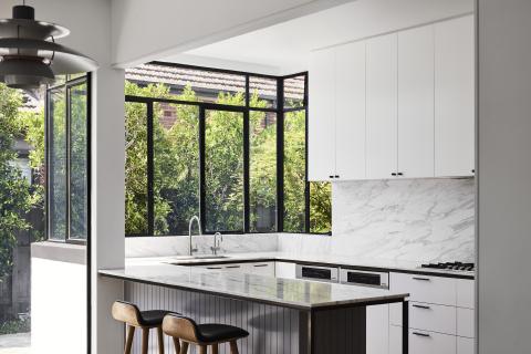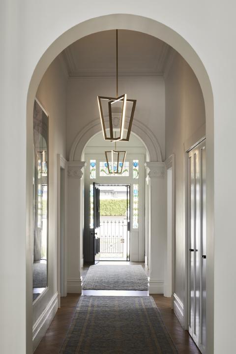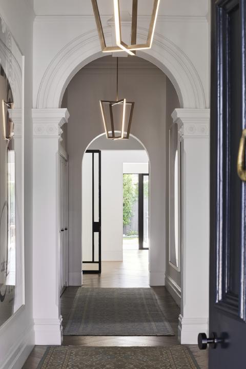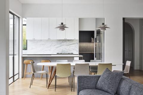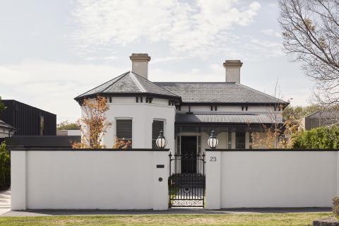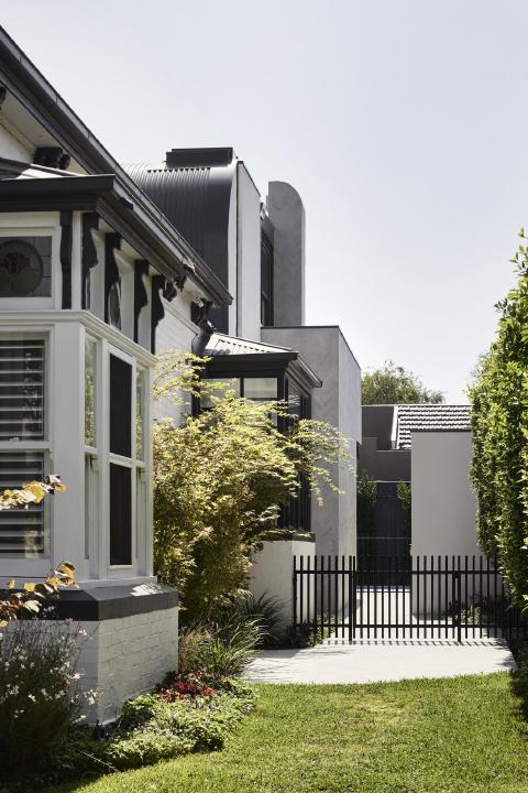 Victorian Villa renews a heritage home in Brighton through a rear addition shaped by curved geometry and a controlled relationship to the garden. The Victorian façade is restored to the street, while new work is gathered into a rounded volume behind, set back to minimise its presence within the established streetscape. Ribbed metal cladding and a curved roof reduce visual bulk, and full-height glazing is placed where privacy can be maintained to bring light into the main living rooms and address the pool courtyard.